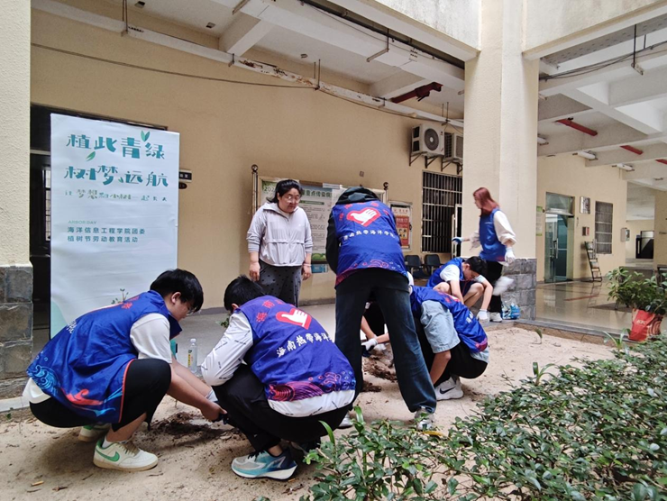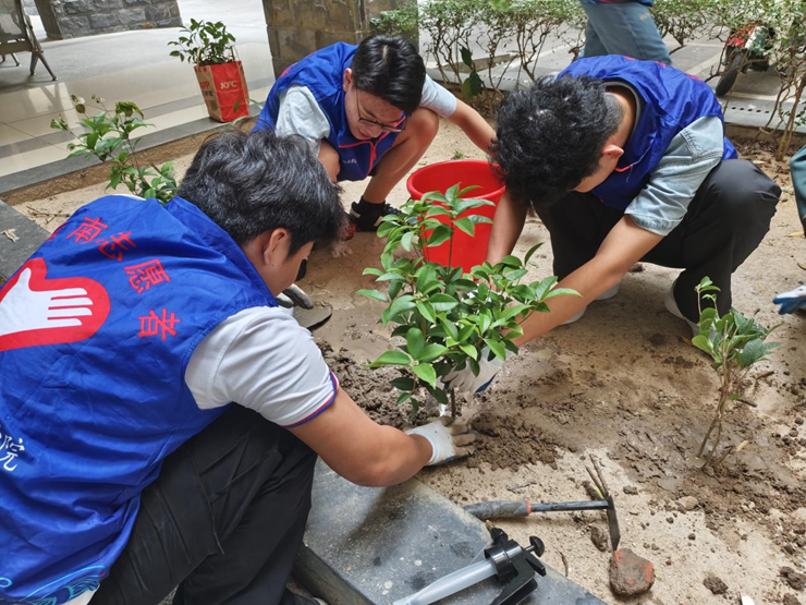 活动现场,员工志愿者与老师在公司9栋空地共同种植树苗。同学们分工协作,挥锹挖坑、扶苗培土、提桶浇水,每一道工序都凝聚着汗水与热情。